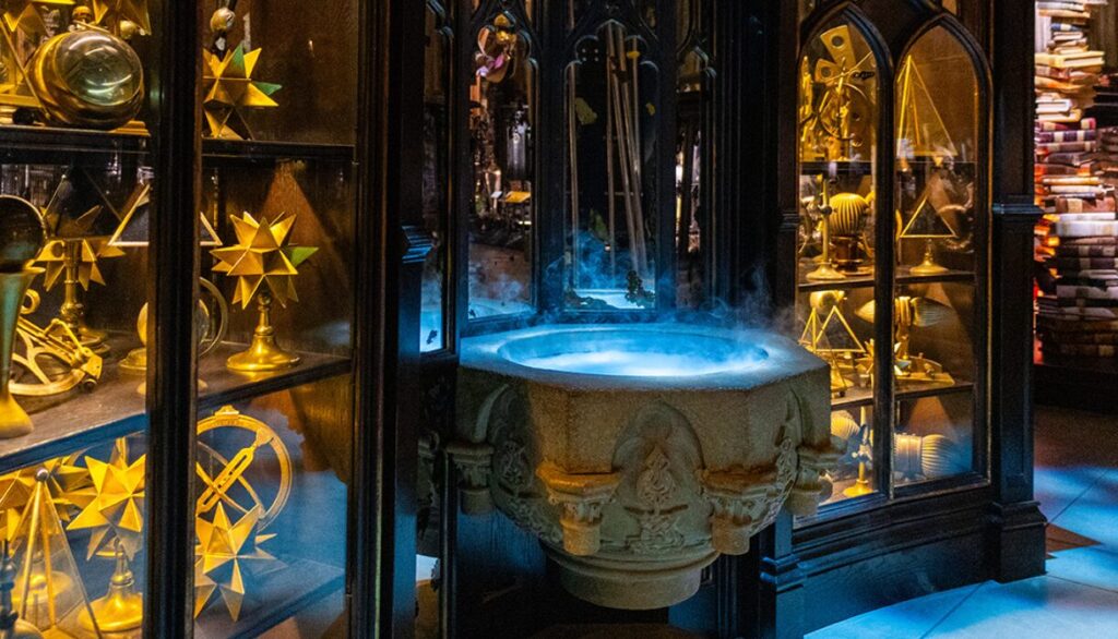 Authentic robes, wands, spellbooks, potion bottles, and magical creatures fill the galleries.