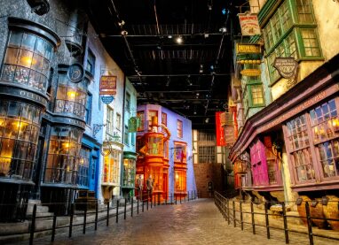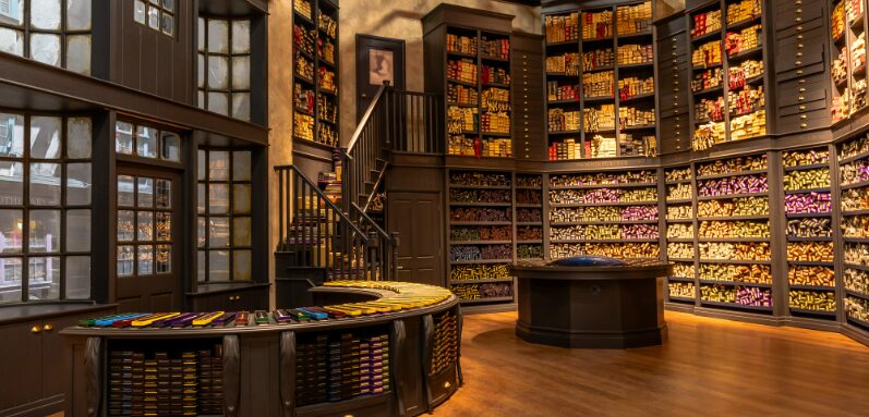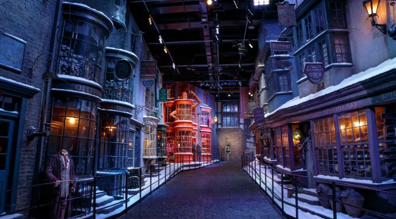 The wizarding world’s most famous shopping street comes alive with storefronts like Ollivanders, Flourish & Blotts, and Weasleys’ Wizard Wheezes.