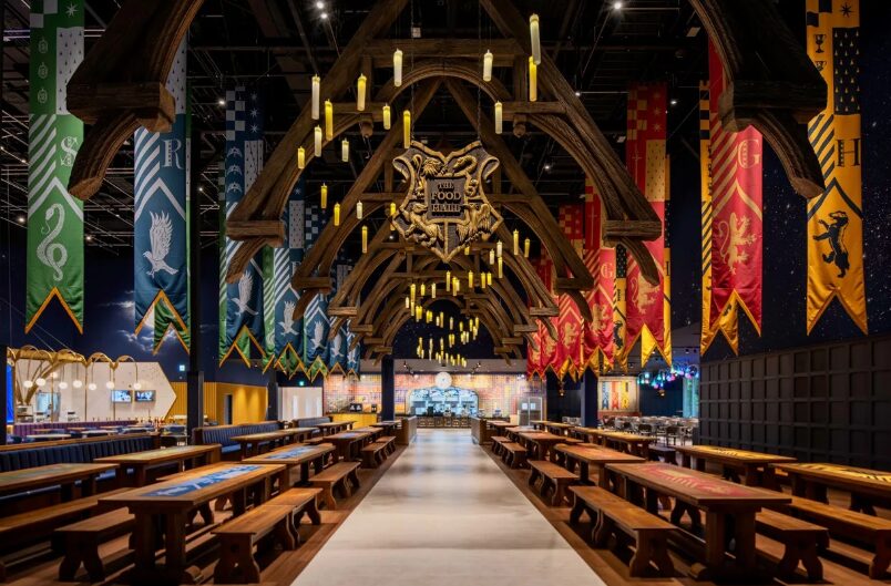 Step into Hogwarts’ beating heart — the dining hall. Long wooden tables, floating candles, and house banners recreate scenes from the films.